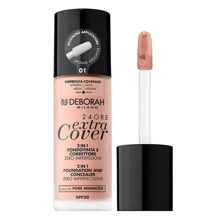 24Ore Extra Cover de Deborah es una base 2 en 1 maquillaje y corrector mate de larga duración que cubre y disimula las imperfecciones del rostro.