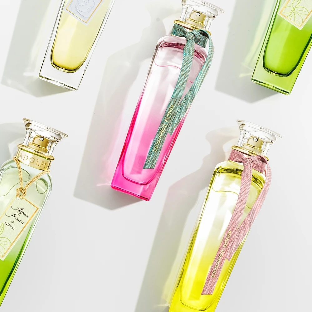 El frasco conserva las líneas puras y rectas de las Aguas Frescas de Adolfo Domínguez. Una botella de vidrio transparente teñida en un amarillo chispeante y suave. En la parte superior, toques dorados acompañados de un precioso lazo rosa que cae del cuello y aporta elegancia y distinción al conjunto del frasco.