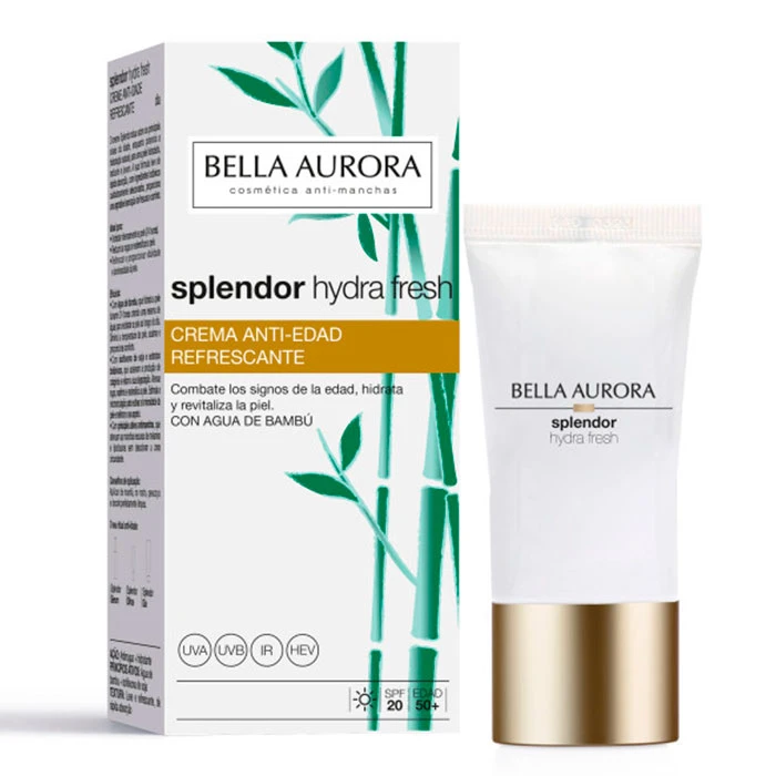 Incluye SPF20 que protegen frente a la radiación UVA, UVB, IR y luz visible y un efecto refrescante que reduce la temperatura de la piel calmando la irritación. De textura refrescante, no grasa se desliza sobre el rostro y envuelve de suavidad la piel. Bella Aurora SPLENDOR Hydra Fresh Crema Anti-Edad está indicada para hidratar, reafirmar, refrescar, combatir los signos de la edad, reparar el ADN y retrasar el envejecimiento de la barrera cutánea en un solo gesto, especialmente para piel a partir de 50 años. El rostro luce más lisa, firme, fresca y luminosa.