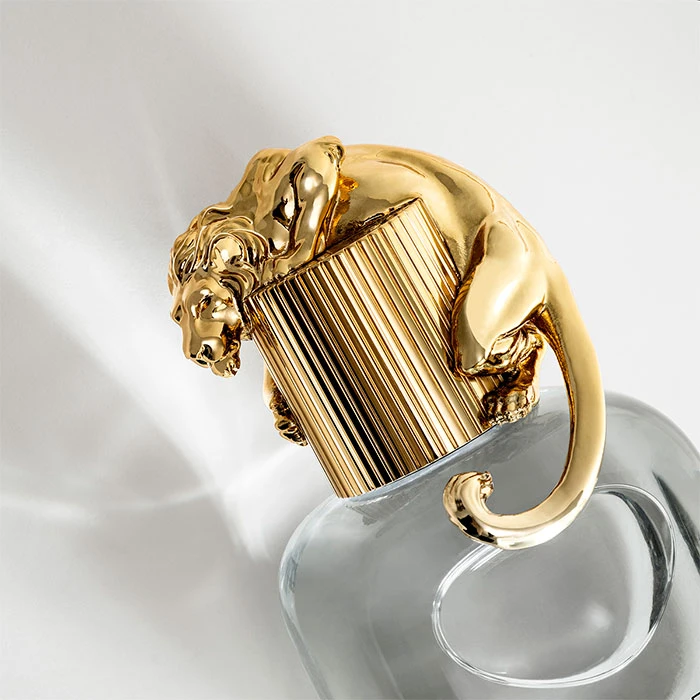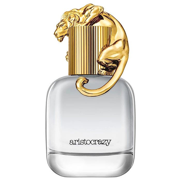 El lujoso frasco de Aristocrazy Brave está realzado por un poderoso león, posado sobre el tapón joya de acabado dorado brillante. El vidrio de la botella es transparente, de líneas redondeadas y sofisticadas. Brave, atrévete a ser libre.