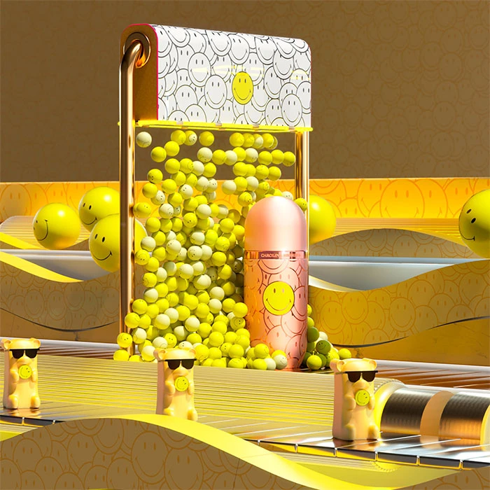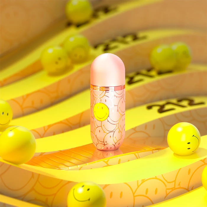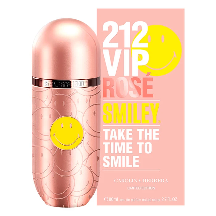 Este Eau de Parfum de edición limitada, se crea en 2022 para celebrar el 50 aniversario del icónico Smiley, un símbolo global de positividad y felicidad. Esta versión más divertida de la clásica 212 VIP Rosé desprende un aroma estimulante que te hará sonreír al instante.