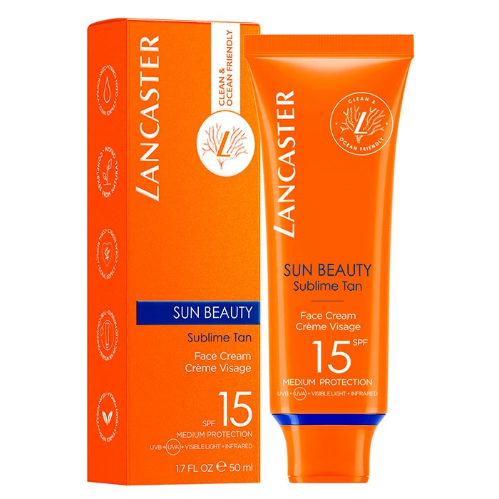 Sun Beauty Sublime Face Cream SPF15 de Lancaster es un protector solar facial con tecnología infrarrojos que ayuda a reparar la piel.