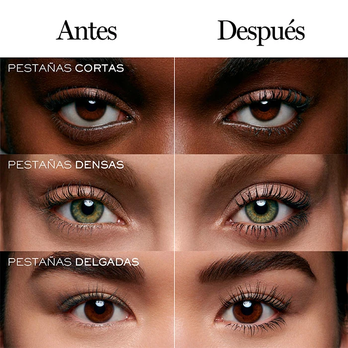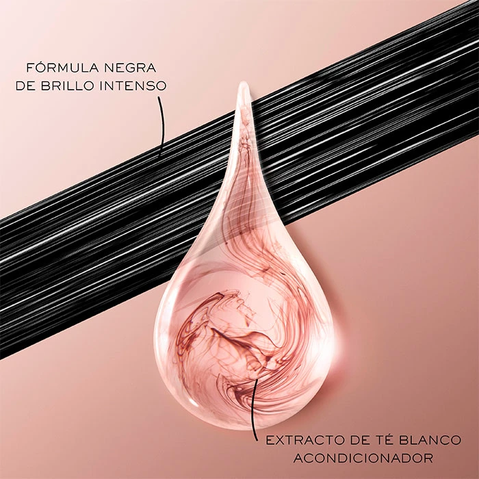 Su cepillo curvado en forma de arco tiene 360 microcerdas y 250 tamaños distintos para adaptarse a la perfección al borde de las pestañas, incluso a las más pequeñas. Su textura ligera emulsión en gel , contiene extracto de té blanco y menos cera, por lo que se desliza suavemente sin esfuerzo para aportar un color negro azabache durante 24 horas . Testada oftalmológicamente y adecuada para ojos sensibles.