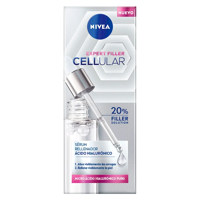 Cellular Expert Filler Sérum Rellenador de Nivea es un sérum de ácido hialurónico que alisa y rellena las arrugas de la piel.