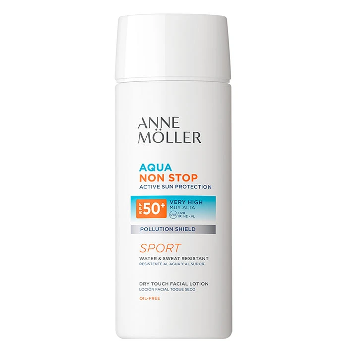 Non Stop Aqua Loción Facial Toque Seco SPF50+ de Anne Möller es una loción para el rostro que protege frente la radiación UVA, UVB, infrarroja y la luz azul.