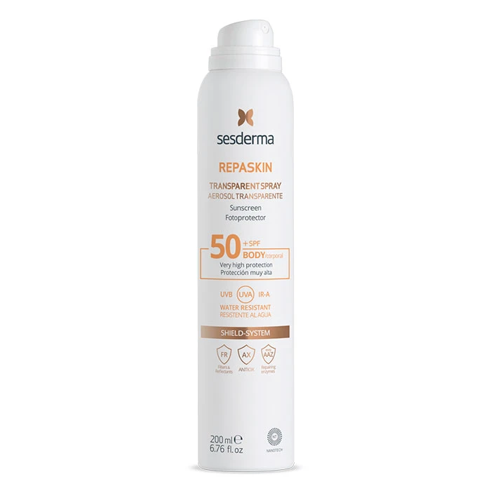 Sesderma Repaskin Aerosol Transparente SPF50+ es perfecto para garantizar la máxima protección en todo tipo de piel y prevenir el envejecimiento prematuro. La piel se rejuvenece y luce un bronceado perfecto.